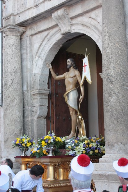 Representação do Ressuscitado que aparece de pé, em passo, levantando a sua mão direita enquanto a esquerda cai segurando o cajado característico da Ressurreição. O pano de pureza, mais do que cobrir a figura, adorna-a, envolvendo a escultura e conferindo-lhe um movimento espiral que é muito eficaz. Andores: Jesus Ressuscitado (1955), desenhados por Leonardo Martínez Bueno, executados pelos Irmãos Pérez del Moral e transportados por 32 irmãos.