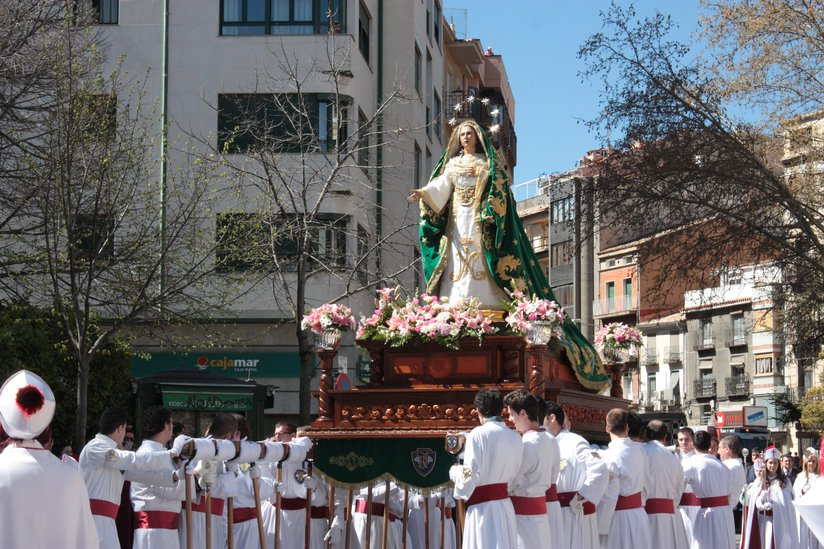 Trata-se de uma escultura com várias vestes. A sua atitude e gestos são tradicionais, embora condicionados, tal como a sua indumentária, pela especificidade do desfile, pois inicialmente aparece como mãe aflita e mergulhada na dor de perder o Filho, para posteriormente surgir feliz e venturosa após o encontro com o seu filho Ressuscitado. Os andores foram projetados e realizados em 1988 pelos Irmãos Nemesio e Modesto Pérez del Moral, transportados por 32 irmãos.